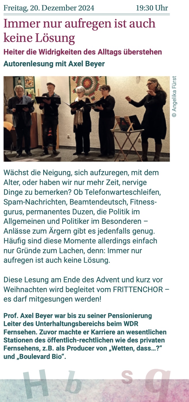 Freitag, 20. Dezember 2024, 19:30 Uhr. Lichtblick – Café, Gisbertstraße 98, 51061 Köln: Begleitung der Autorenlesung von Prof. Dr. Axel Beyer durch den Frittenchor-Köln.